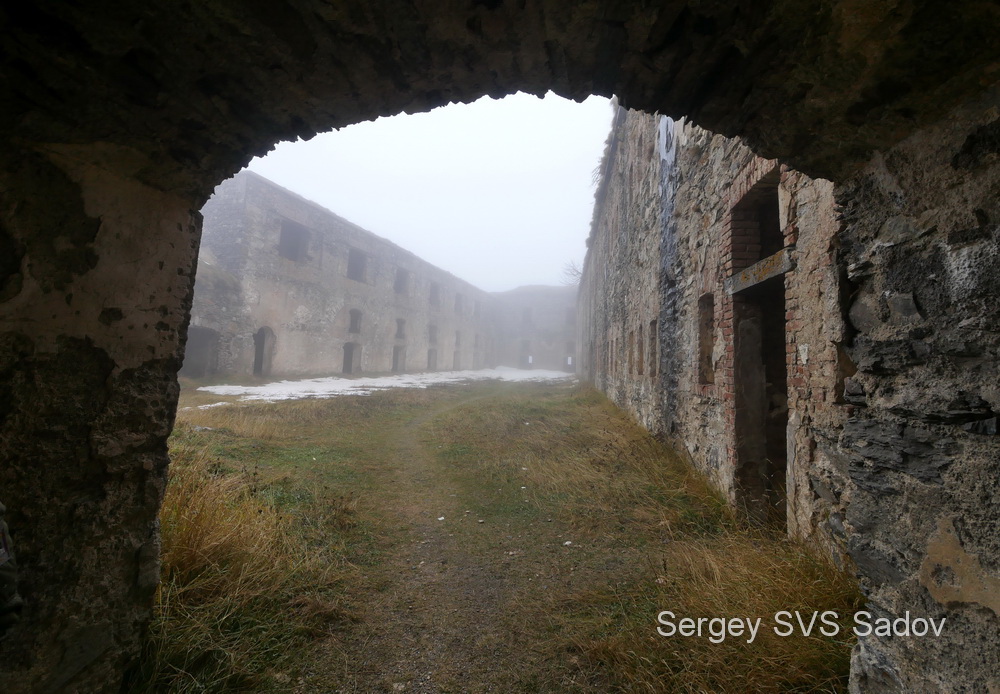 Ну а теперь - посмотрите, каким мы увидели Forte Centrale в первый раз! И учтите, что снимали мы только сначала, а когда туман стал гуще и дожде-снег повалил всерьёз, а туман залез даже внутрь строений - мы конечно же убрали совершенно мокрую аппаратуру под защитный чехол!